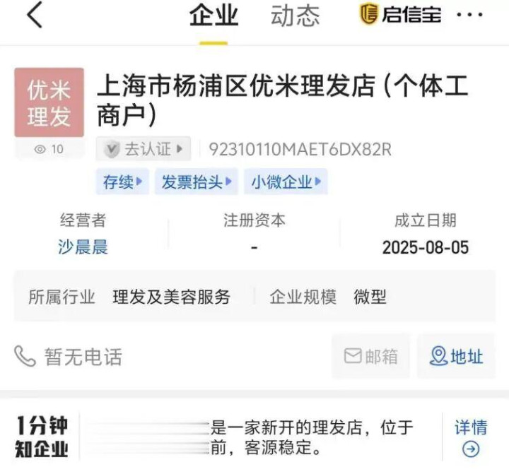 2025年8月5日,合并地址开荒了上海杨浦区优米剃头店。在简介中,企业主先容了该店与前述三匠Salon之间的相干:“三匠好意思发是一家新开的剃头店,位于大学路,排行靠前。”当今,优米剃头店的运筹帷幄情景处于存续情景。当今,该地址剃头店的骨子运筹帷幄商户,即本次事件的牵累主体,为上海市杨浦区优米剃头店。