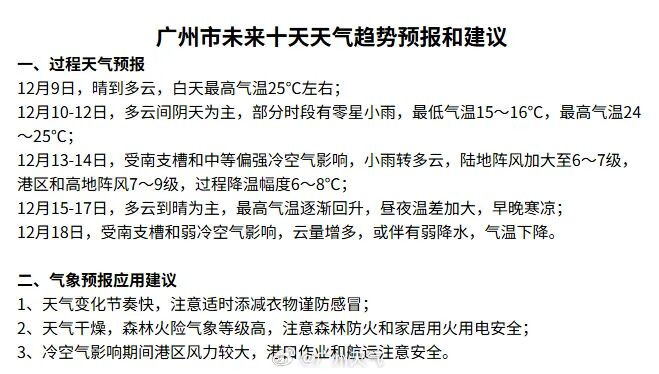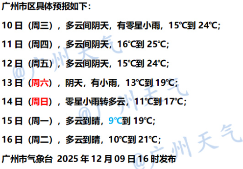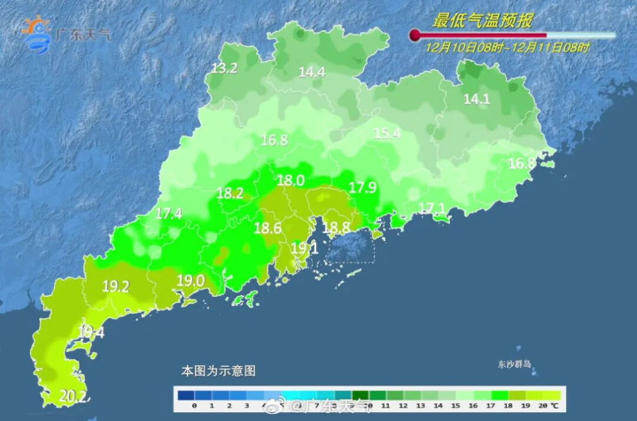 最低气温:粤北和肇庆北部市县10℃~14℃,粤西和珠江三角洲南部市县17℃~20℃,其余市县14℃~17℃。