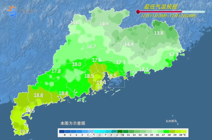 黎明最低气温:粤北和粤东的北部市县12℃~15℃,雷州半岛市县19℃~22℃,其余市县15℃~18℃。